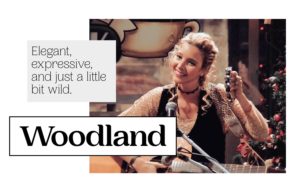 Мы выбрали Woodland, потому что в его пластике читается тот самый «хиппи-вайб»: он органичный, чуть психоделичный и по-хорошему странный. В отличие от строгих классических антикв, Woodland играет с ритмом и формами так, будто он пришел из эпохи расцвета фолк-фестивалей, но при этом уверенно чувствует себя в современном дизайне. Эта гарнитура — визуальное воплощение богемного духа Фиби. За «танцующими» изгибами скрывается характер, который не всегда считывается с первого взгляда: он может быть таким же причудливым, как её песни про кота, но при необходимости Woodland, как и сама Фиби, умеет быть удивительно убедительным и глубоким.