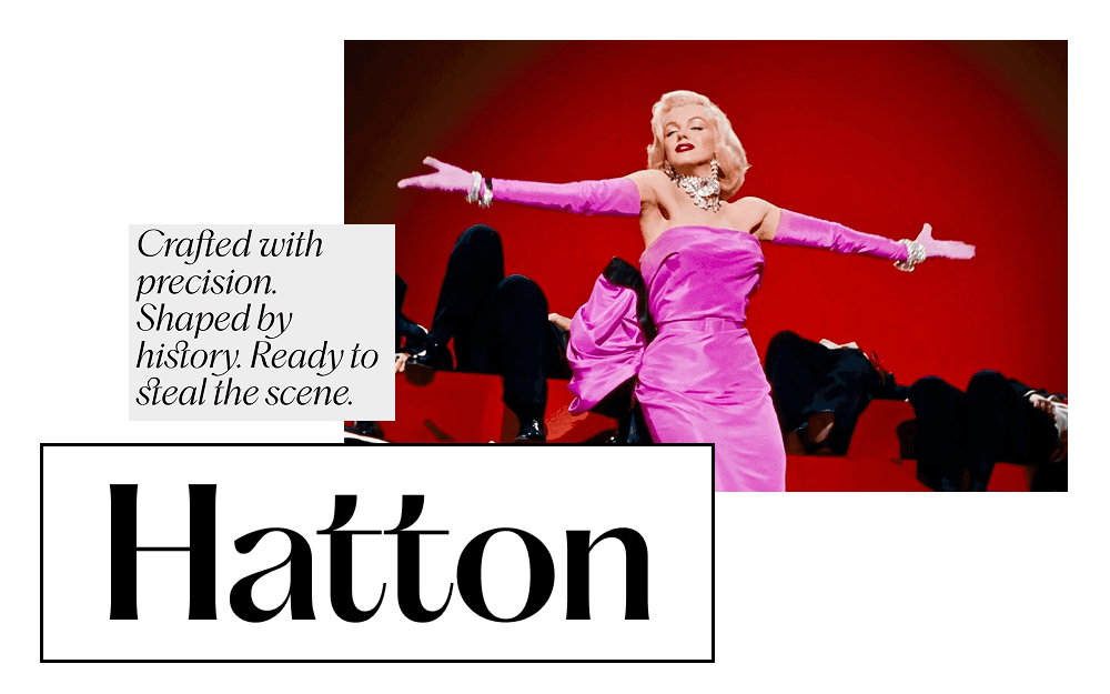 Почему это идеальный мэтч: Hatton задумывался как визуальное воплощение Hatton Garden — легендарного лондонского квартала ювелиров. Этот шрифт пропитан эстетикой драгоценных камней, чистотой граней и тем самым холодным, притягательным блеском, который мы привыкли видеть в витринах элитных бутиков. Для Лорелей Ли, чей мир вращается вокруг бриллиантов, это не просто шрифт, а прямое отражение её образа жизни.