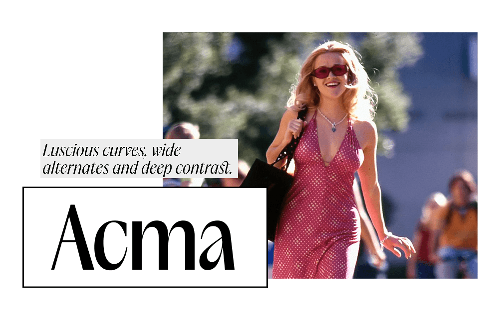 Почему это идеальный мэтч: Acma это гарнитура с высоким контрастом между тонкими и толстыми штрихами. В её пластике есть грация и уверенная ритмика, которая позволяет гарнитуре оставаться строгой и четкой, не теряя при этом женственности и ироничного, «подиумного» лоска.