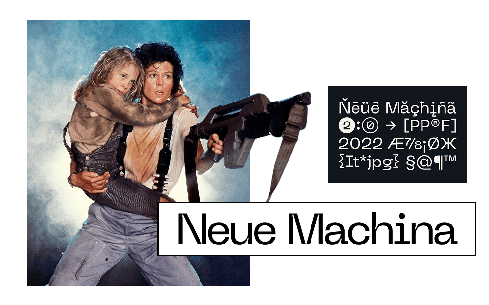 В гарнитуре мы видим радикально прямые линии и жесткие формы, которые напоминают детали футуристических интерфейсов. Но самое крутое — её универсальность: Neue Machina одинаково мощно работает и как акцентный шрифт для крупных заголовков, и как читабельный массив текста. Это комбо-функциональность в чистом виде: шрифт такой же надежный, собранный и «на все случаи жизни», как и сама Эллен Рипли.
