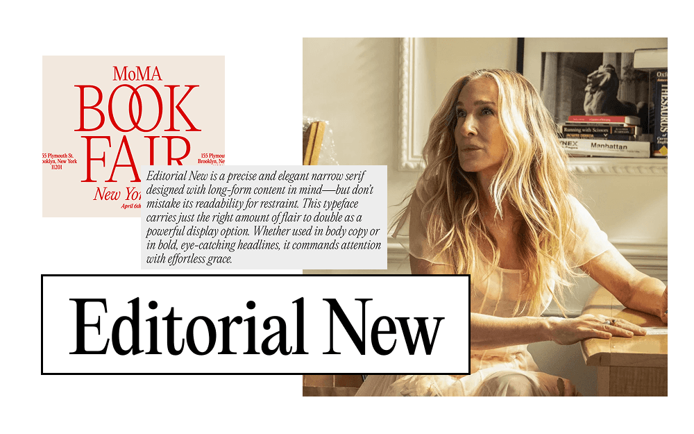 Почему это идеальный мэтч: Сами создатели описывают эту гарнитур как воплощение «газетной эстетики» (newspapery aesthetic), что для Кэрри — прямой профессиональный оммаж. Как переходная антиква, Editorial New несет в себе ДНК нью-йоркской прессы: здесь чувствуется ритм города и та самая «печатная» элегантность, с которой Кэрри пишет свои колонки для The New York Observer.